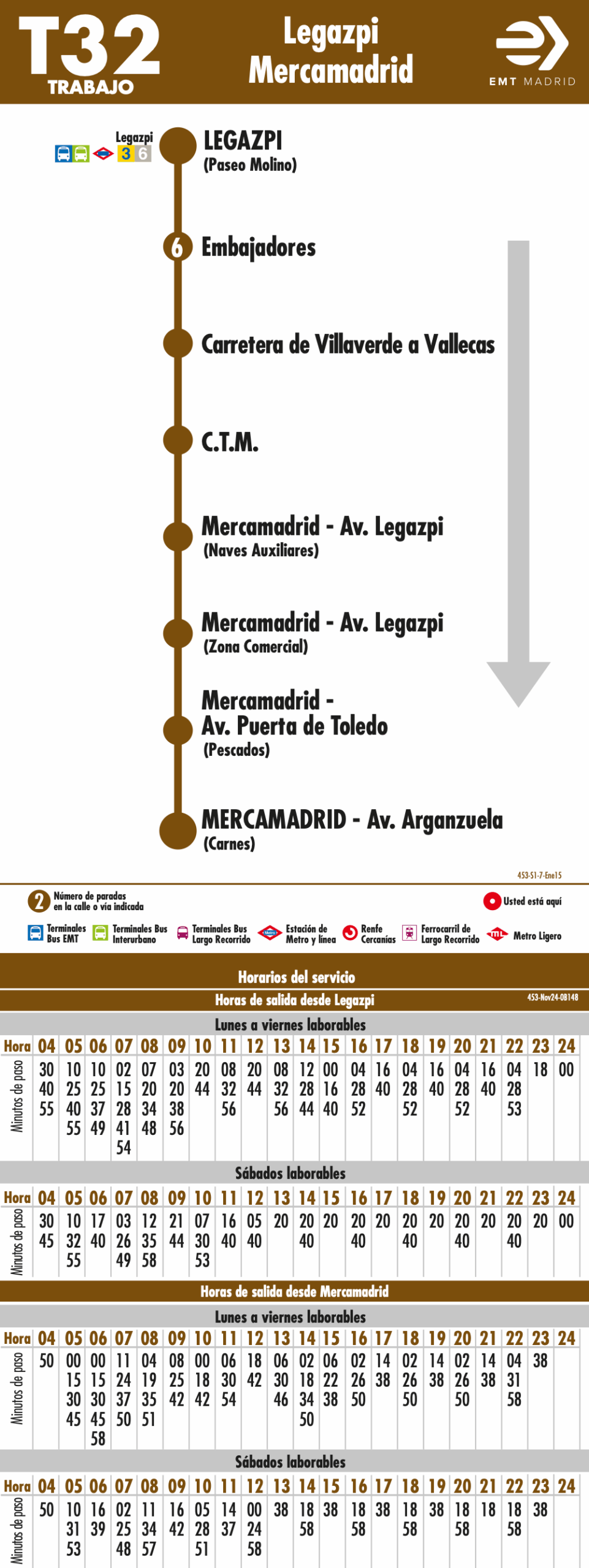 La línea T32: Plaza de Legazpi – Mercamadrid. Gracias al Convenio de colaboración firmado entre Mercamadrid, S.A. y la EMT, esta línea presta sus servicios desde las 4:30 a 24:00 (desde Legazpi) y de 4:50 a 23:38 (desde Mercamadrid) todos los días laborables, de lunes a sábado, con el objetivo de fomentar, facilitar y cubrir las necesidades de transporte público de los trabajadores y usuarios de la Unidad Alimentaria.